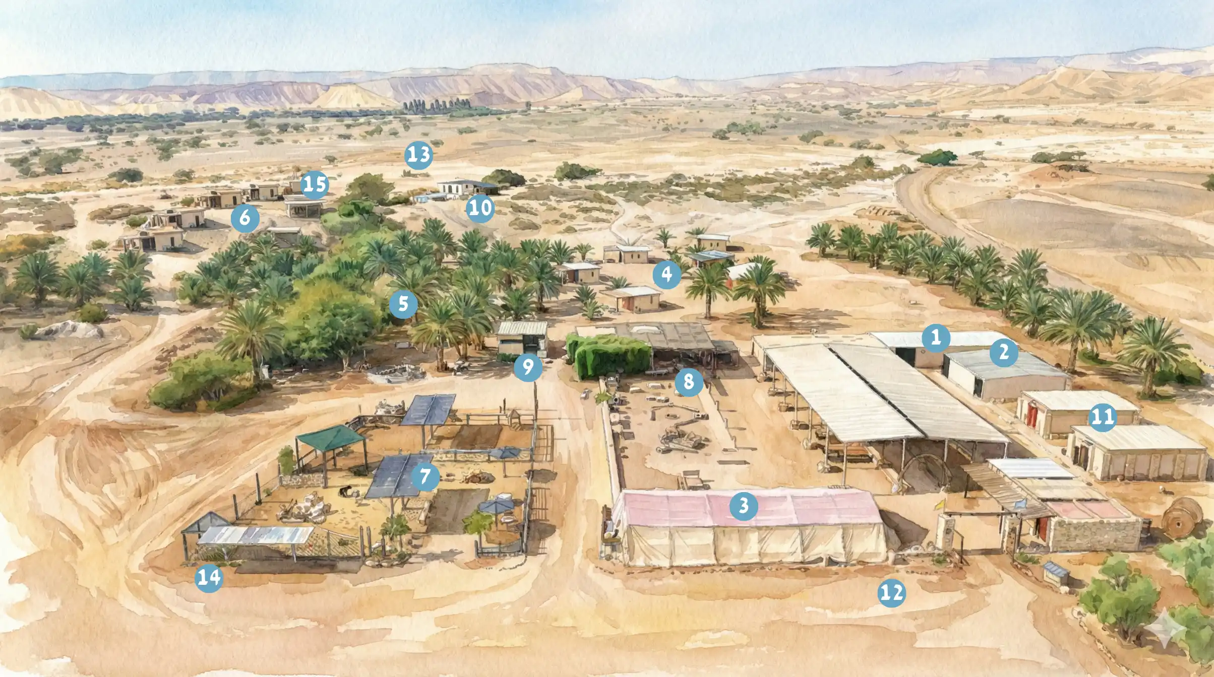 חווית האירוח בחאן ממשיכה הרבה מעבר לפתח החדר שלכם. יצרנו במתחם עולם שלם שנועד לחבר אתכם לסביבה ולרוגע: החל מטבילה מרעננת בבריכות המים מול הנוף האינסופי, דרך המפגש הבלתי-אמצעי עם בעלי החיים בפינת החי שלנו, ועד לארוחות המוגשות בלבביות על מחצלות ומזרונים, ממש כמו שאכלו לפני שנים רבות הנוודים בדרך הבשמים. כשהערב יורד והמדורות נדלקות, הלב של החאן פועם בקצב איטי ונעים, תחת שמיים זרועי כוכבים.